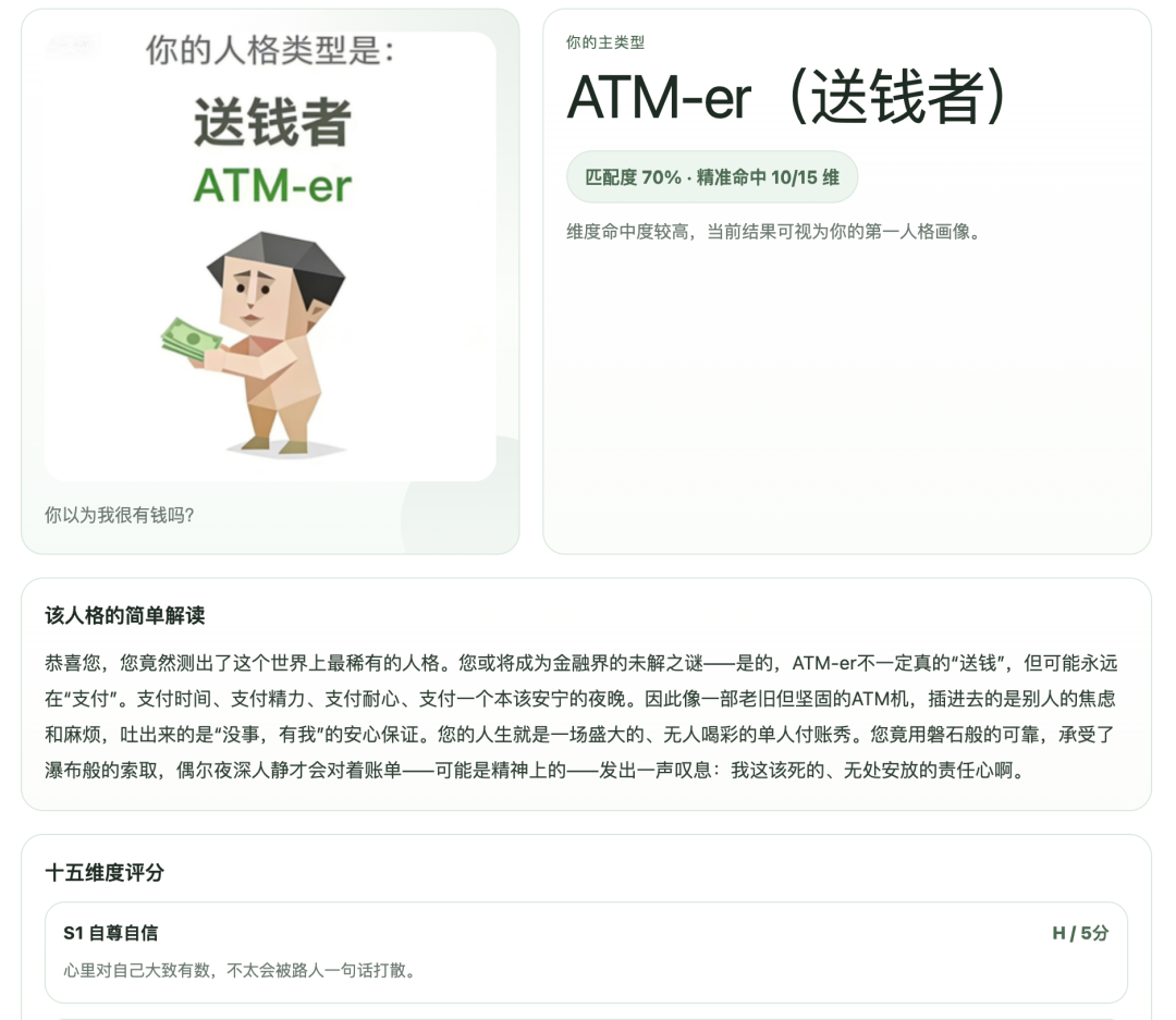 送钱者的描述为:“恭喜您,您竟然测出了这个世界上最稀有的人格。您或将成为金融界的未解之谜-是的,ATM-er不一定真的“送钱”,但可能永远在“支付”。支付时间、支付精力、支付耐心、支付一个本该安宁的夜晚。因此像一部老旧但坚固的ATM机,插进去的是别人的焦虑和麻烦,吐出来的是“没事,有我"的安心保证。”