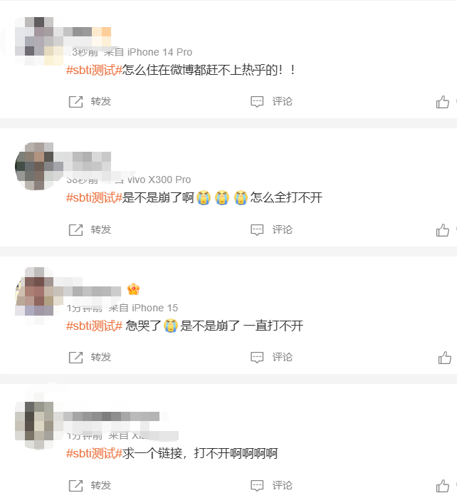 但是由于突然的爆火,致使大量用户页面崩溃、链接打不开,只能靠截图云体验,可见大家也对自己的的"SBTI"非常好奇。